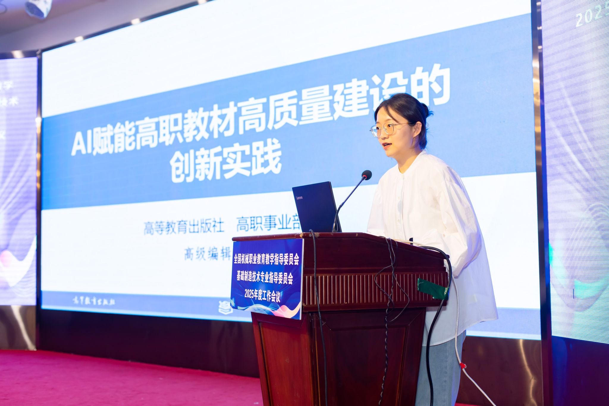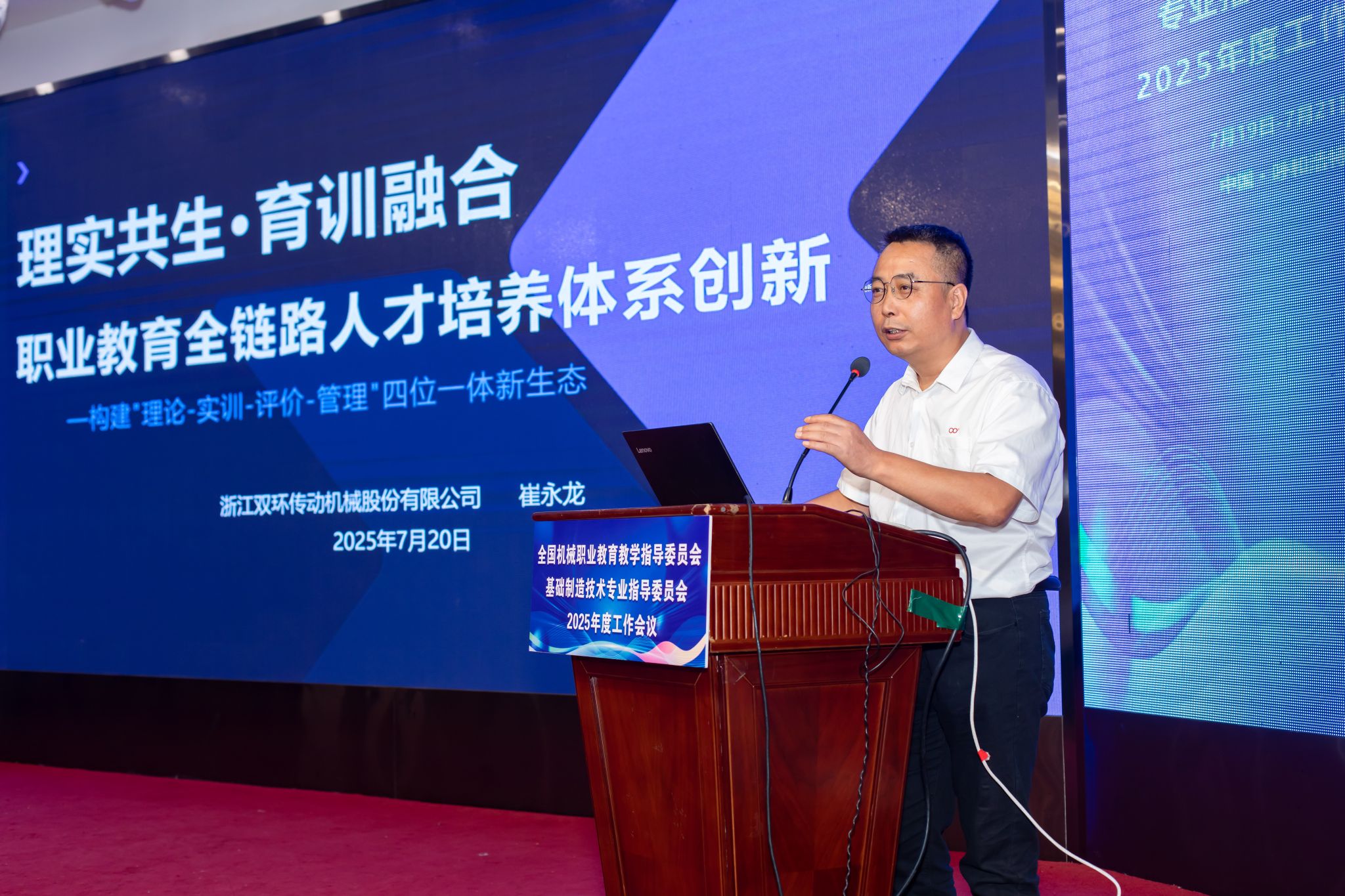 会议还邀请了北京航空航天大学特聘副研究员邰振赢、高等教育出版社主任、高级编辑张璋,及苏州千机智能技术有限公司董事长赵建军、浙江双环传动股份有限公司智能制造总监崔永龙作为企业家代表分别以《人工智能技术在智能制造领域应用探索》《数智时代AI赋能高职教材高质量建设的创新实践》《立足自主可控CAM技术,赋能基础制造人才培养》《理实共生育训融合——职业教育全链路人才培养体系创新》为题做了专题报告。