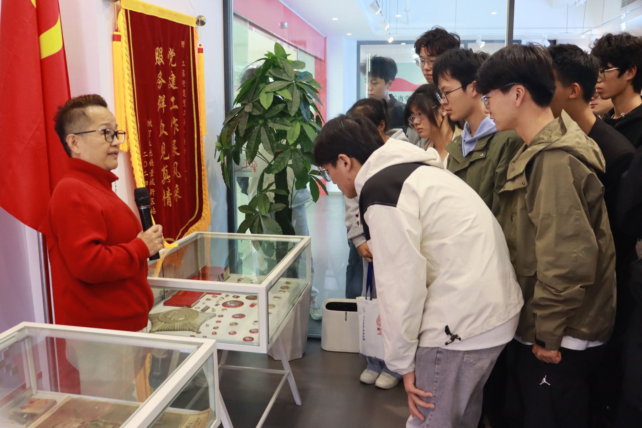 在“百姓藏物 抗战印记”展厅内,来自街道居民私人珍藏的抗战实物静静陈列,每一件都镌刻着烽火岁月的印记。毛主席徽章、泛黄的书信、磨损的书刊,静默而有力地诉说着抗日战争中江苏人民艰苦卓绝的奋斗历程。桑书记对每一件藏品如数家珍,为在场师生仔细讲解藏品背后的故事。从记录战时讯息的旧报纸到曾吹响冲锋号角的冲锋号,师生们仿佛置身于那段烽火连天的峥嵘岁月,深受震撼。