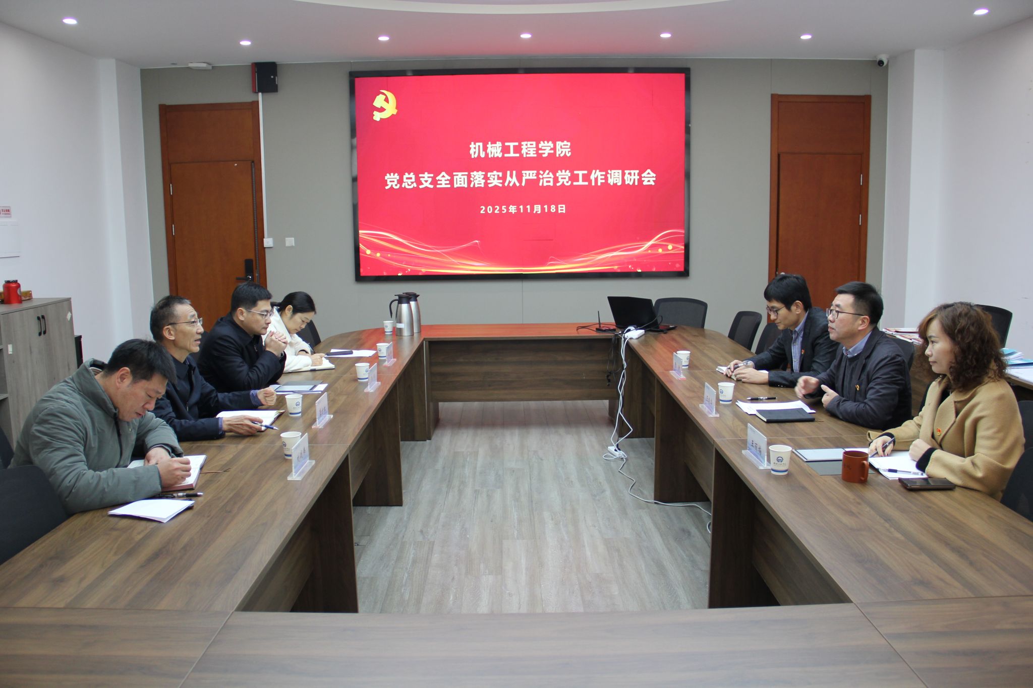 11月18日上午,校党委书记龚方红一行来到机械工程学院,围绕“压实责任链条,强化党建引领——以全面从严治党推动高职院校高质量发展”主题开展专项调研工作。校党委委员、组织部部长朱翔,校党委办公室主任刘战伟,校纪委办公室王小梅等同志随同调研。机械工程学院党总支书记王振华及领导班子成员陪同调研。调研会议在工业中心S206会议室召开,由王振华同志主持。