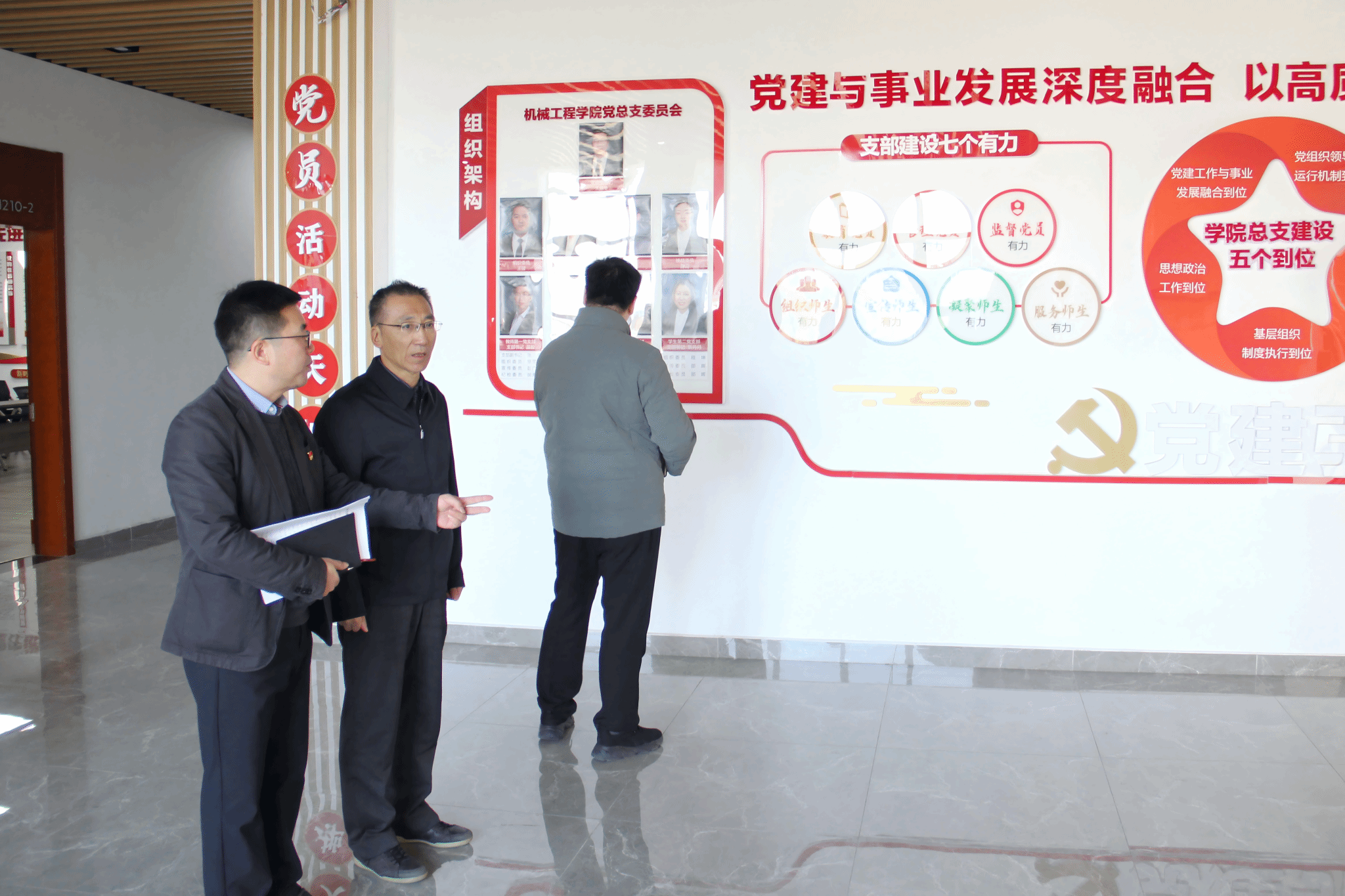 调研伊始,龚方红书记一行实地走访了学院党员活动室、教师发展中心、辅导员工作室、材料先进分析与表征实验室、机械工程创新中心等场所,详细查看党建文化布置情况,深入了解党建与教学科研融合的实践场景,对学院将党建元素融入实训教学环境的做法给予了肯定。